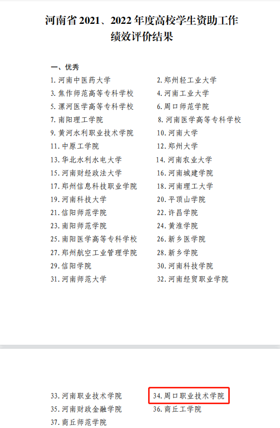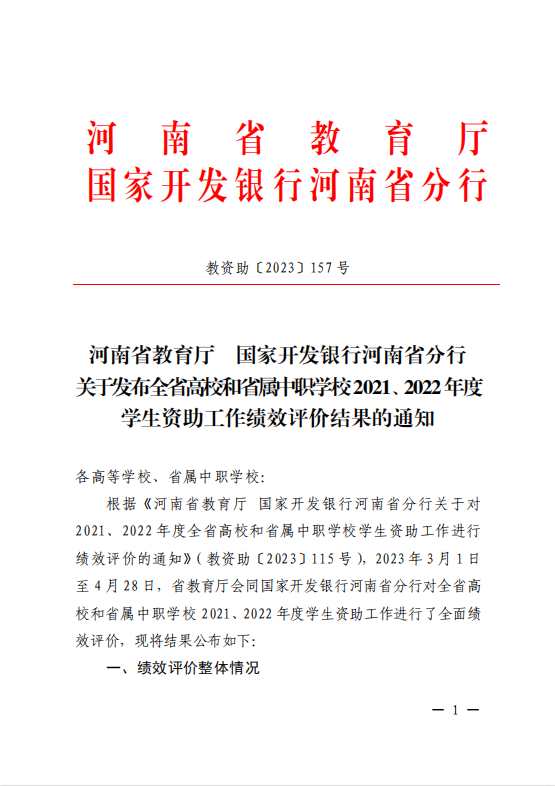 近日,河南省教育厅、国家开发银行河南省分行联合印发了《关于发布全省高校和省属中职学校2021、2022年度学生资助工作绩效评价结果的通知》,白菜官网在此次全省学生资助工作绩效评价中被评为“优秀”等级。